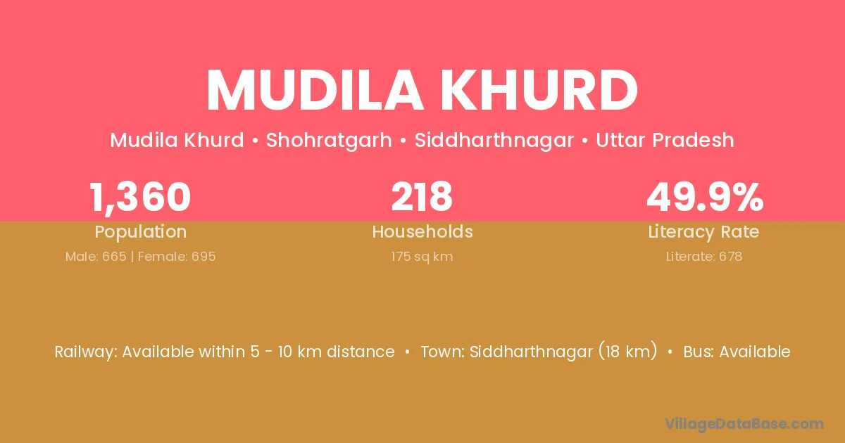 Siddharthnagar (18 km) is the nearest town to Mudila Khurd village for major economic activities and is located approximately 18 km away.