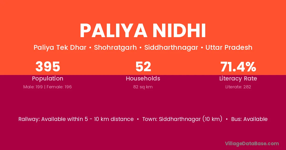 Siddharthnagar (10 km) is the nearest town to Paliya Nidhi village for major economic activities and is located approximately 10 km away.