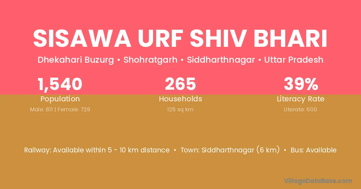 Siddharthnagar (6 km) is the nearest town to Sisawa Urf Shiv Bhari village for major economic activities and is located approximately 6 km away.
