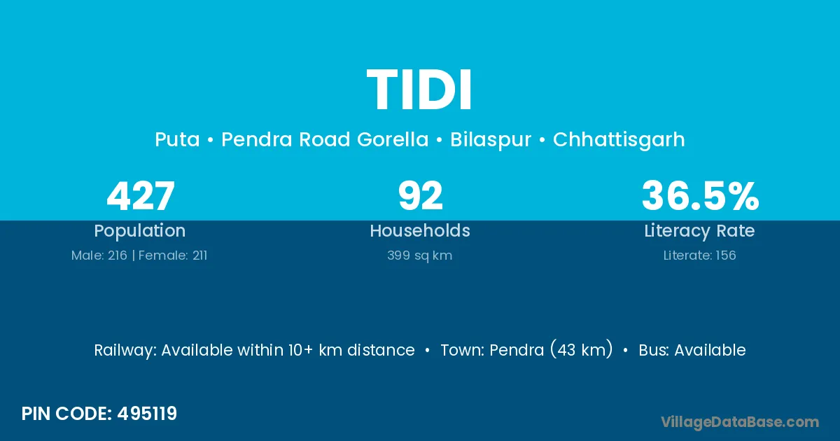 Siddharthnagar (23 km) is the nearest town to Tidi village for major economic activities and is located approximately 23 km away.