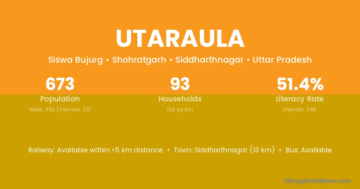 Siddharthnagar (13 km) is the nearest town to Utaraula village for major economic activities and is located approximately 13 km away.