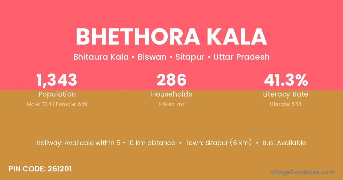Sitapur (6 km) is the nearest town to Bhethora Kala village for major economic activities and is located approximately 6 km away.