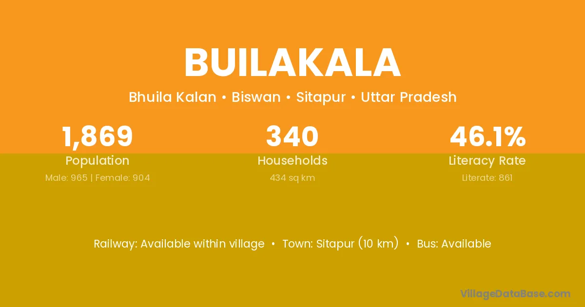Builakala village has a total population of 1,869 people, of which 965 are males and 904 are females.