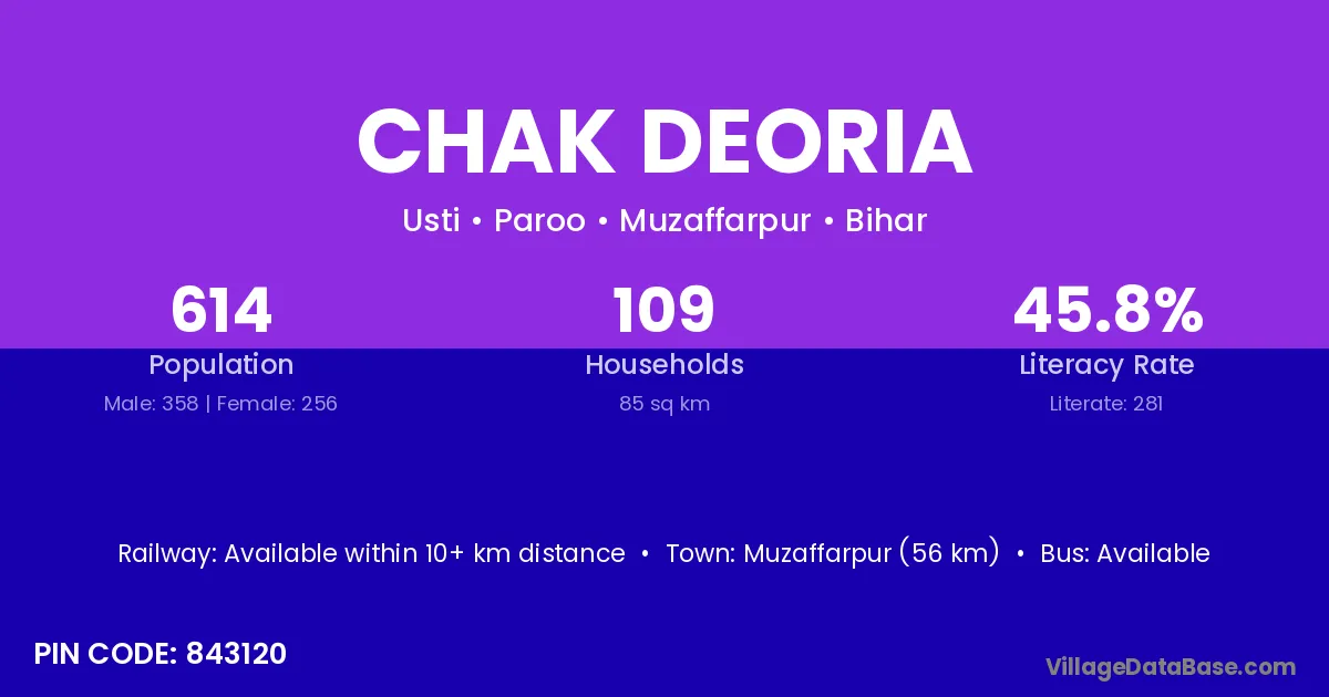 The literacy rate of Chak Deoria village is 42.49%. Male literacy stands at 52.06% and female literacy at 31.06%.