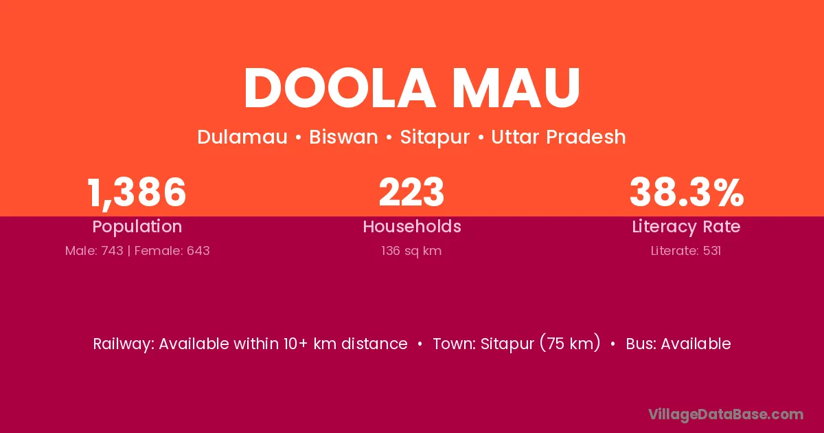 Sitapur (75 km) is the nearest town to Doola Mau village for major economic activities and is located approximately 75 km away.