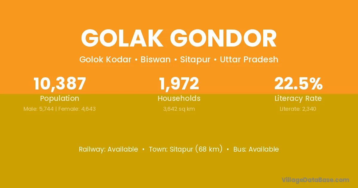 Sitapur (68 km) is the nearest town to Golak Gondor village for major economic activities and is located approximately 68 km away.