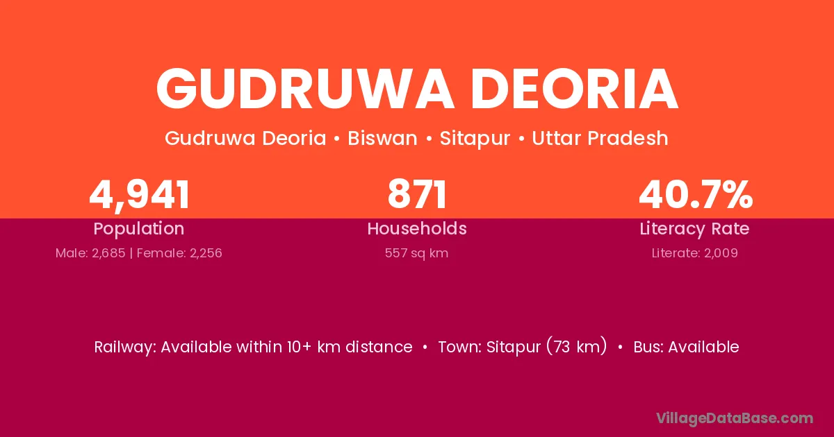 Sitapur (73 km) is the nearest town to Gudruwa Deoria village for major economic activities and is located approximately 73 km away.