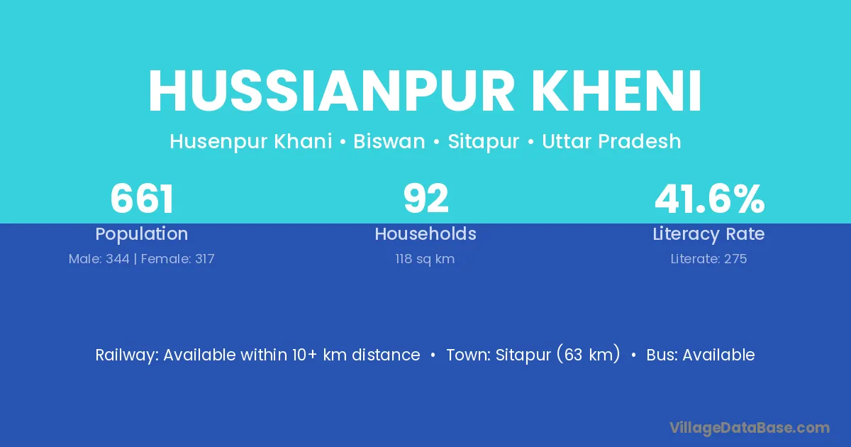 Hussianpur Kheni village has a total population of 661 people, of which 344 are males and 317 are females.