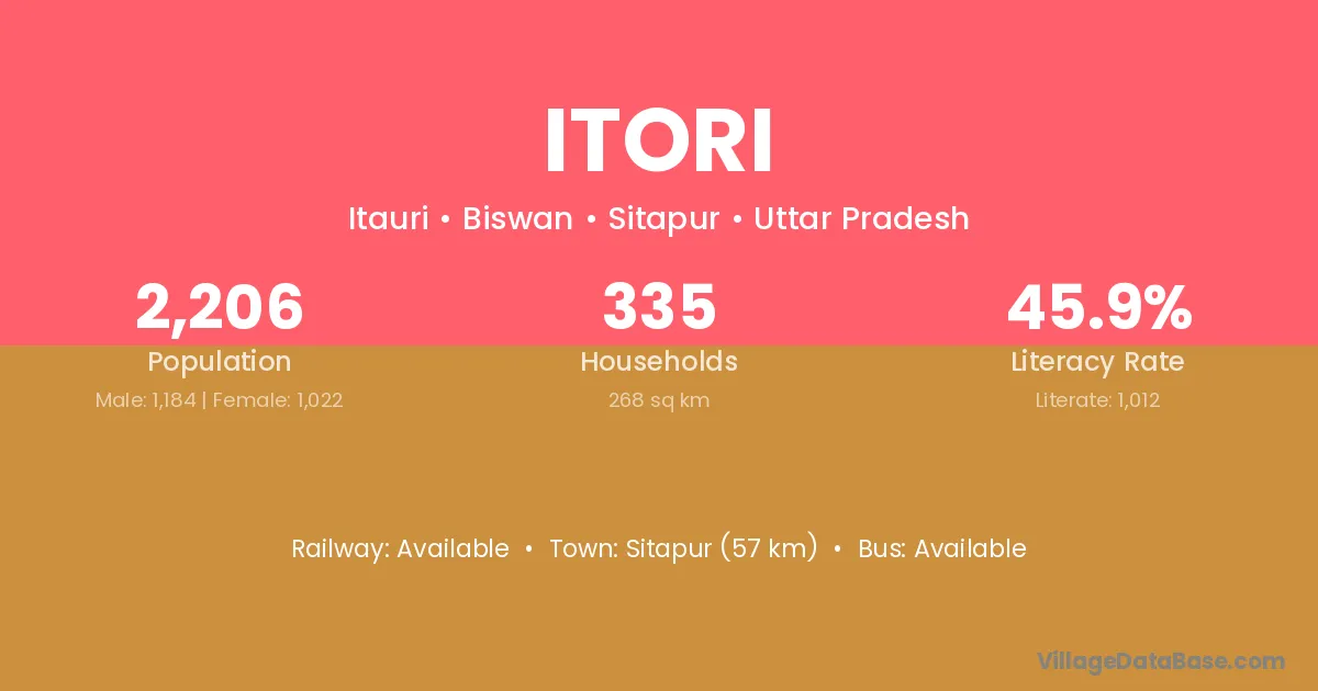 Sitapur (57 km) is the nearest town to Itori village for major economic activities and is located approximately 57 km away.