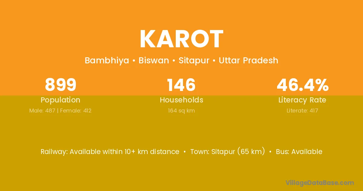 Sitapur (65 km) is the nearest town to Karot village for major economic activities and is located approximately 65 km away.