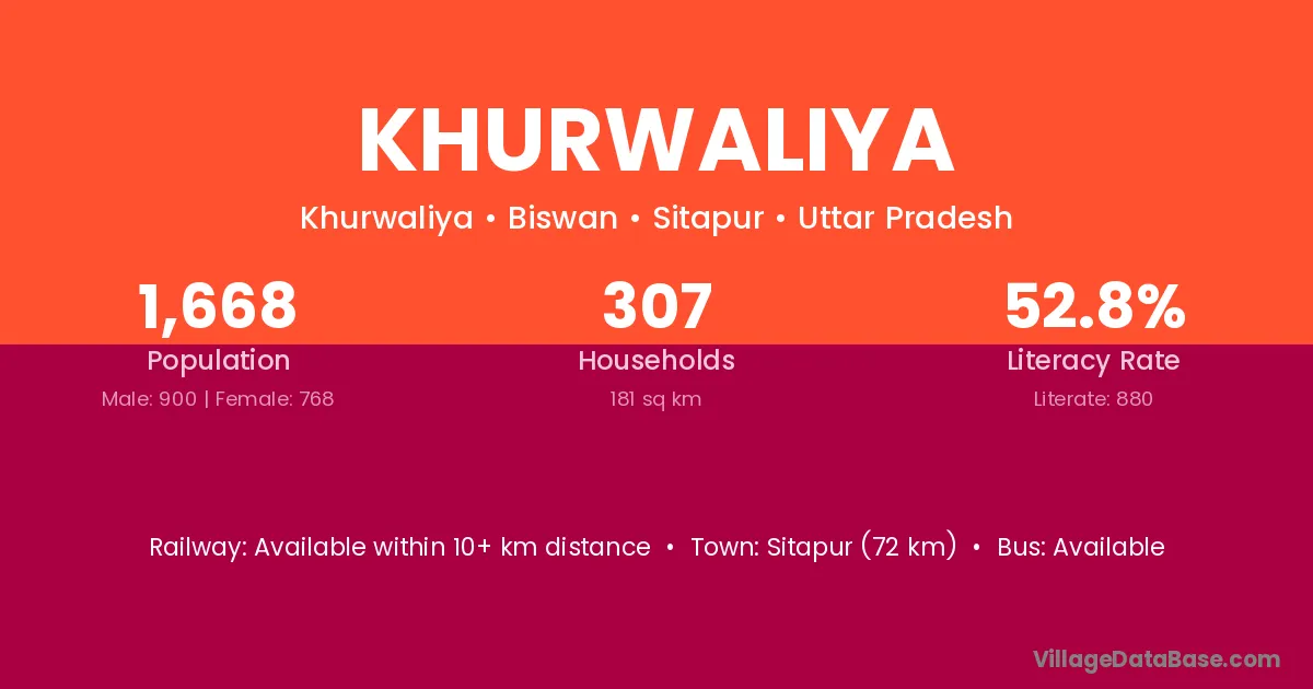 Sitapur (72 km) is the nearest town to Khurwaliya village for major economic activities and is located approximately 72 km away.