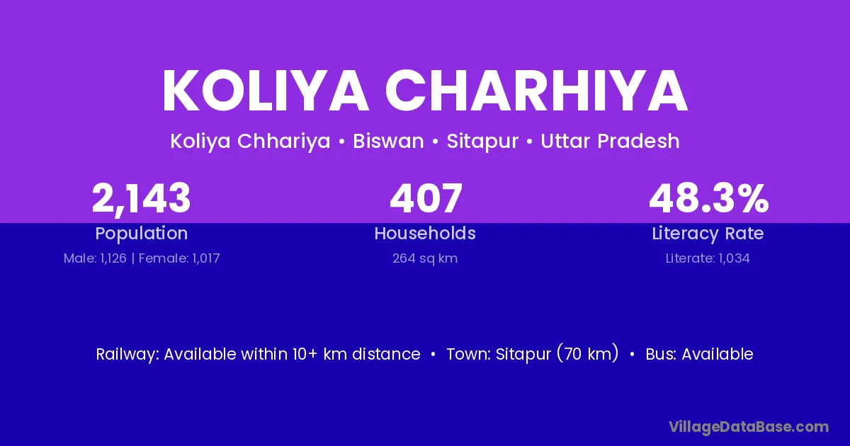 Sitapur (70 km) is the nearest town to Koliya Charhiya village for major economic activities and is located approximately 70 km away.
