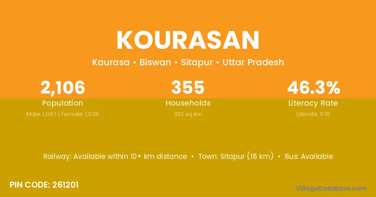 Sitapur (16 km) is the nearest town to Kourasan village for major economic activities and is located approximately 16 km away.