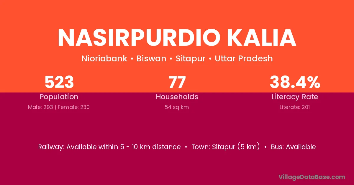 Sitapur (5 km) is the nearest town to Nasirpurdio Kalia village for major economic activities and is located approximately 5 km away.