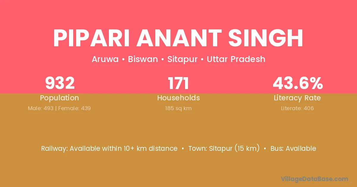 Sitapur (15 km) is the nearest town to Pipari Anant Singh village for major economic activities and is located approximately 15 km away.