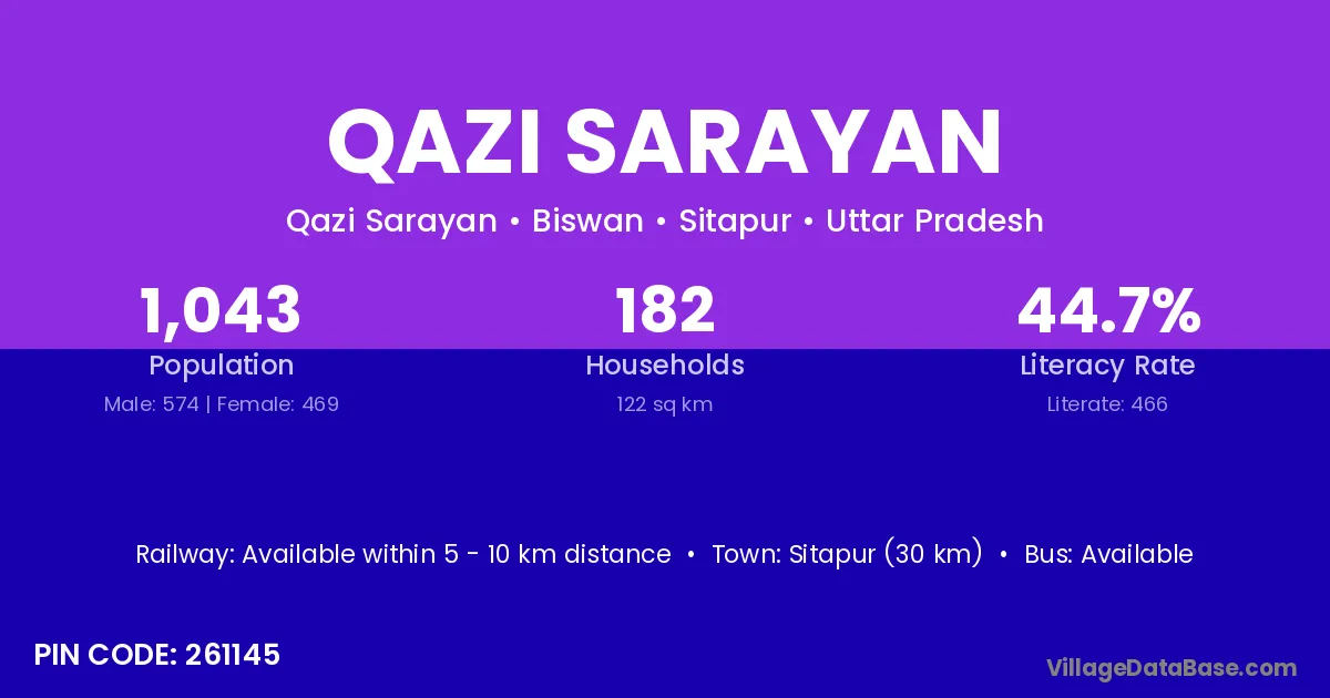 Sitapur (30 km) is the nearest town to Qazi Sarayan village for major economic activities and is located approximately 30 km away.