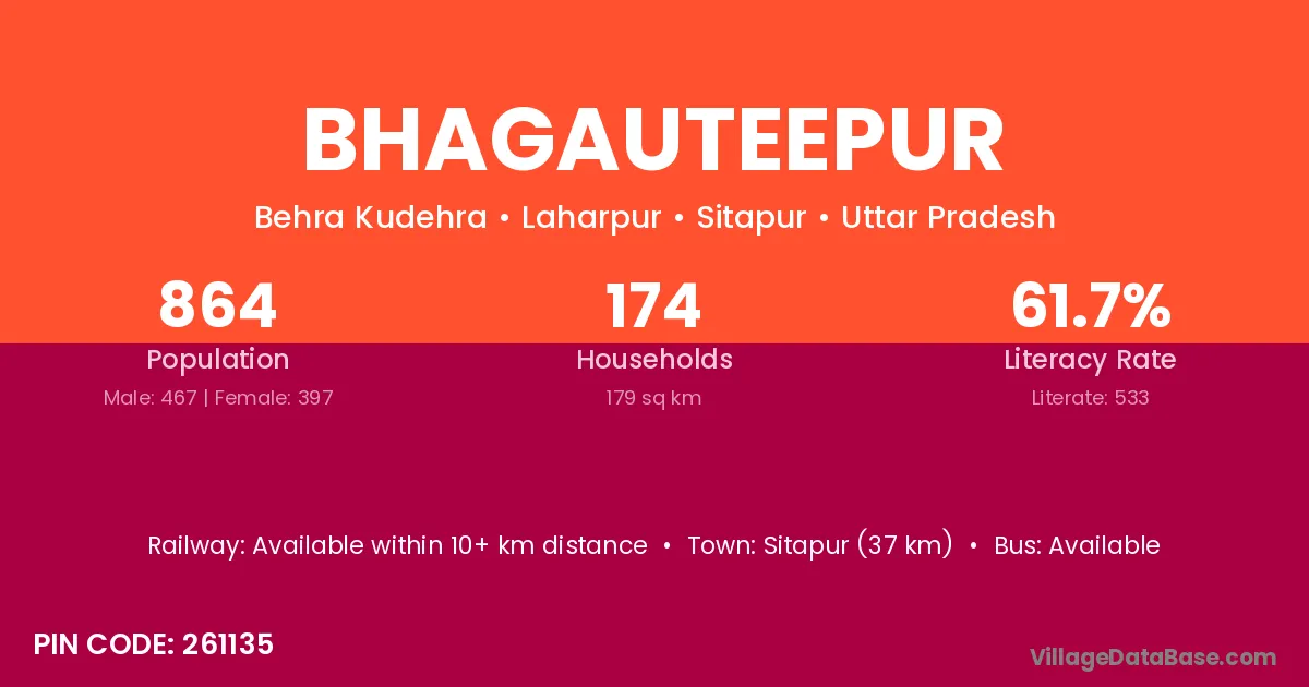 Bhagauteepur village has a total population of 864 people, of which 467 are males and 397 are females.