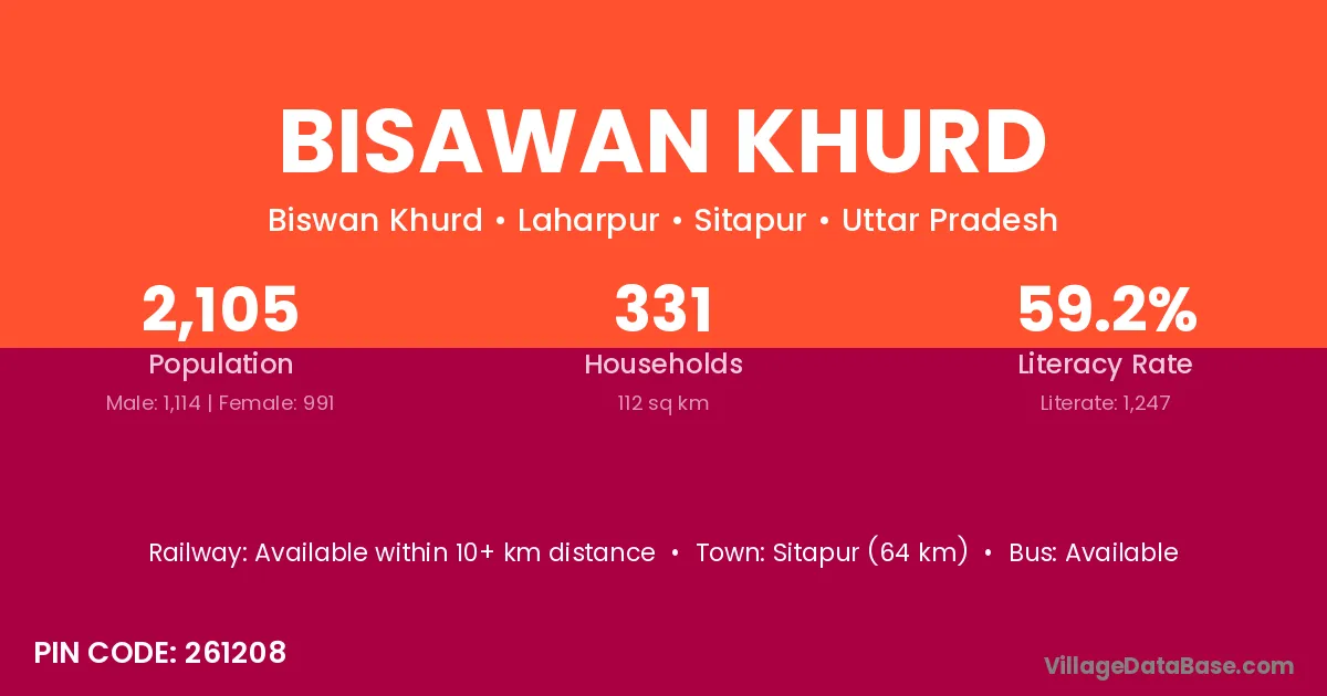 Sitapur (64 km) is the nearest town to Bisawan Khurd village for major economic activities and is located approximately 64 km away.