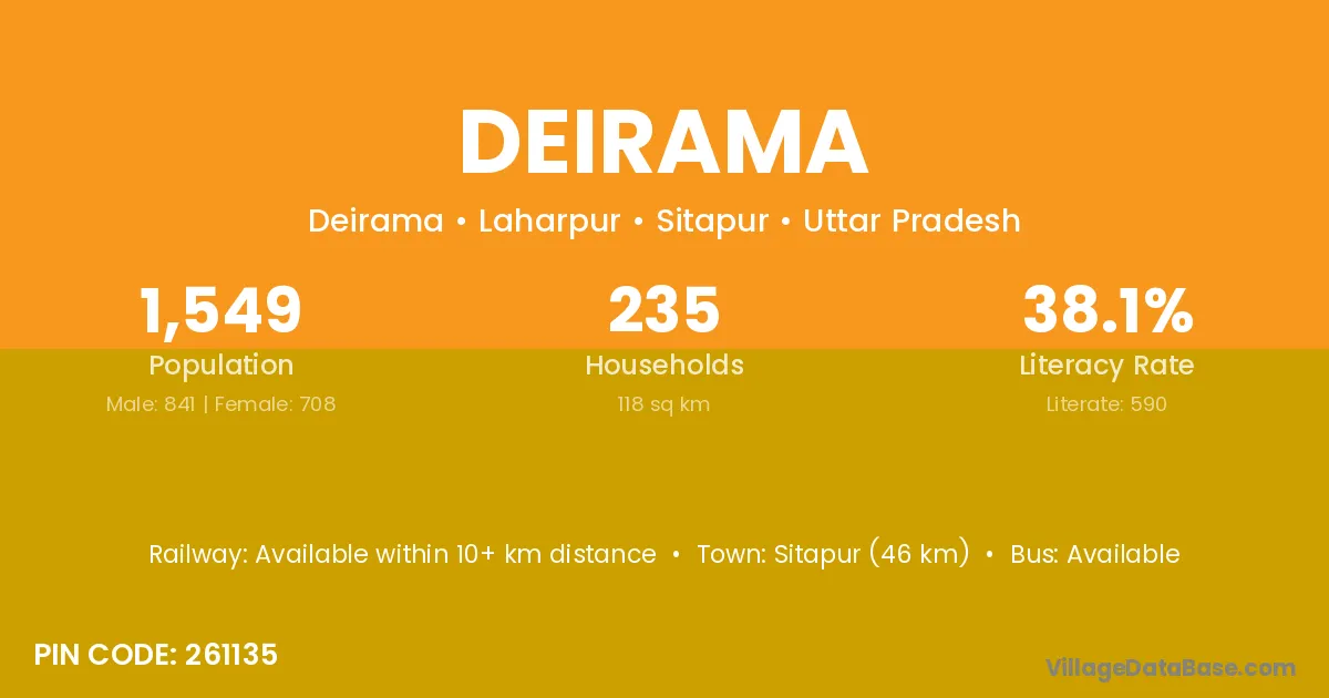 Sitapur (46 km) is the nearest town to Deirama village for major economic activities and is located approximately 46 km away.