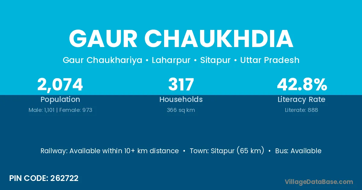 Sitapur (65 km) is the nearest town to Gaur Chaukhdia village for major economic activities and is located approximately 65 km away.