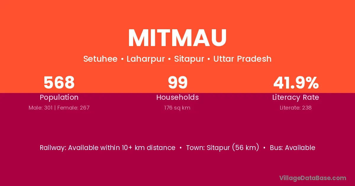 Sitapur (56 km) is the nearest town to Mitmau village for major economic activities and is located approximately 56 km away.