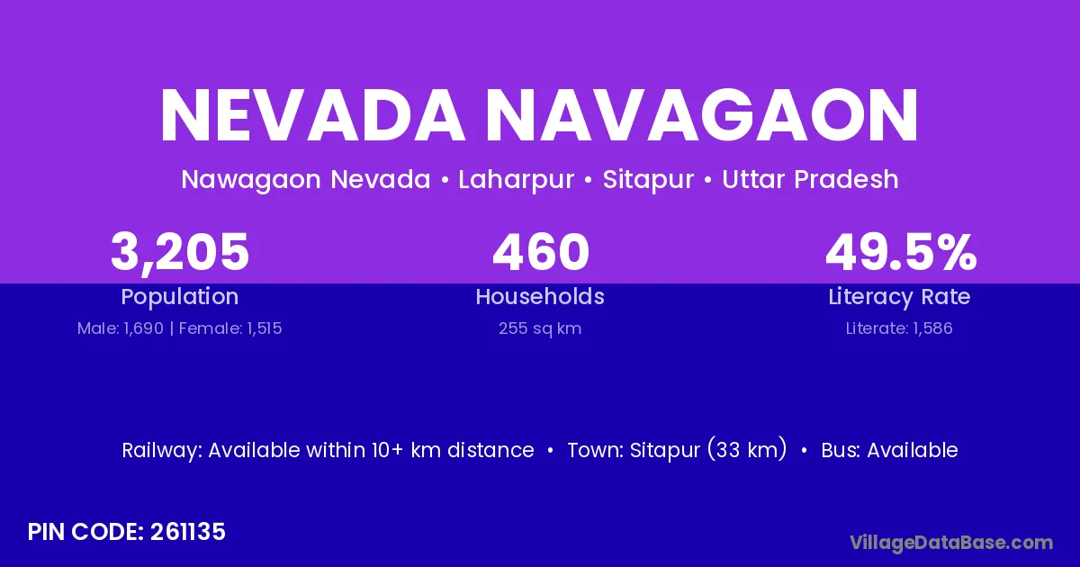 Sitapur (33 km) is the nearest town to Nevada Navagaon village for major economic activities and is located approximately 33 km away.