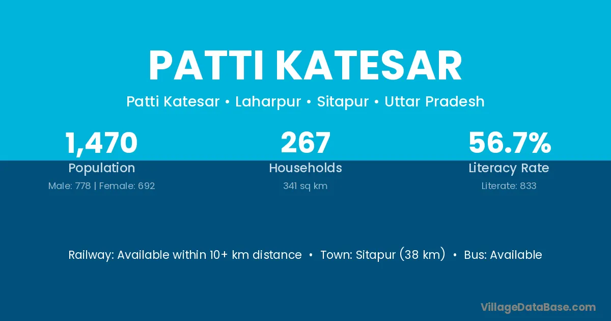 Sitapur (38 km) is the nearest town to Patti Katesar village for major economic activities and is located approximately 38 km away.