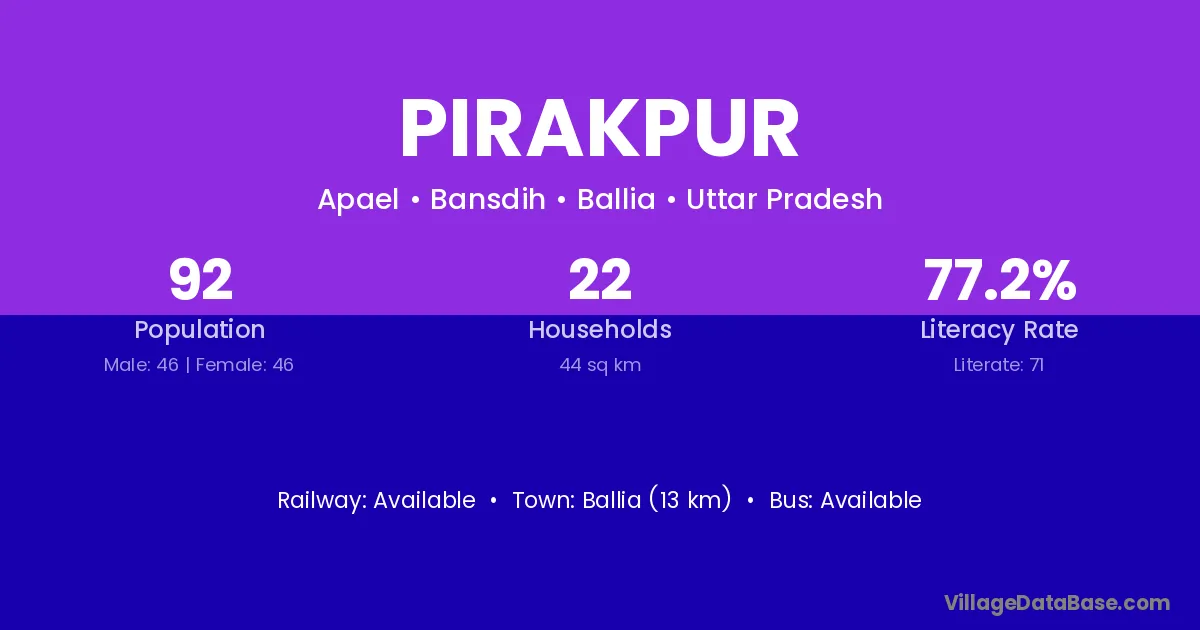 The literacy rate of Pirakpur village is 44.41%. Male literacy stands at 51.77% and female literacy at 36.16%.