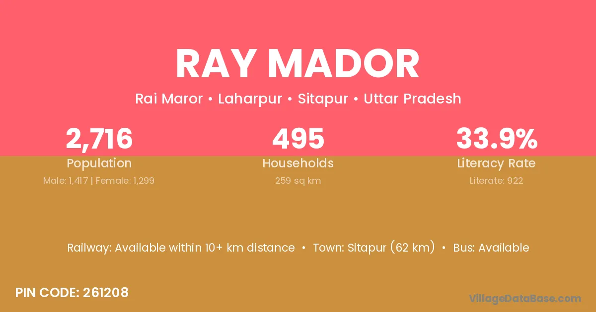 Sitapur (62 km) is the nearest town to Ray Mador village for major economic activities and is located approximately 62 km away.