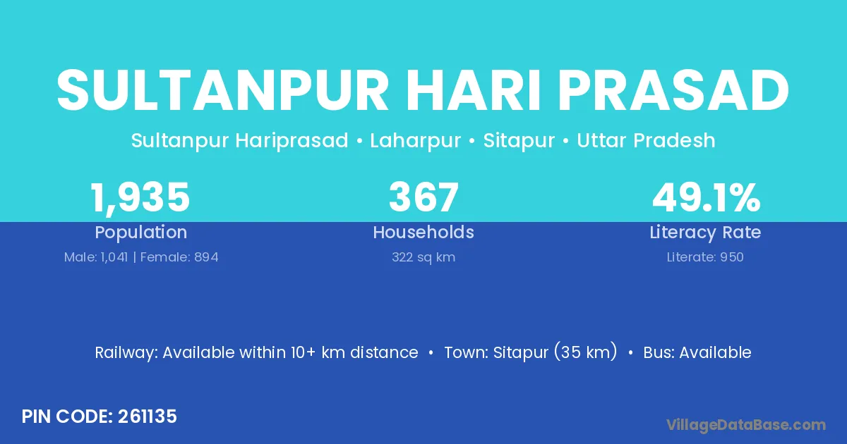 Sultanpur Hari Prasad village has a total population of 1,935 people, of which 1,041 are males and 894 are females.
