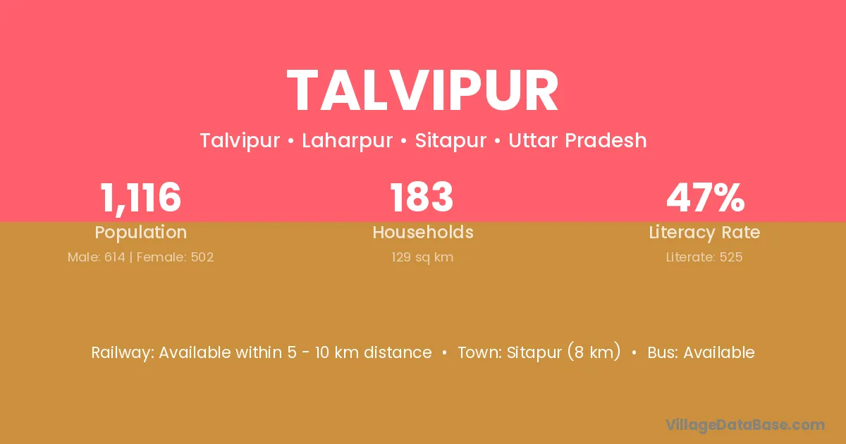 Sitapur (8 km) is the nearest town to Talvipur village for major economic activities and is located approximately 8 km away.