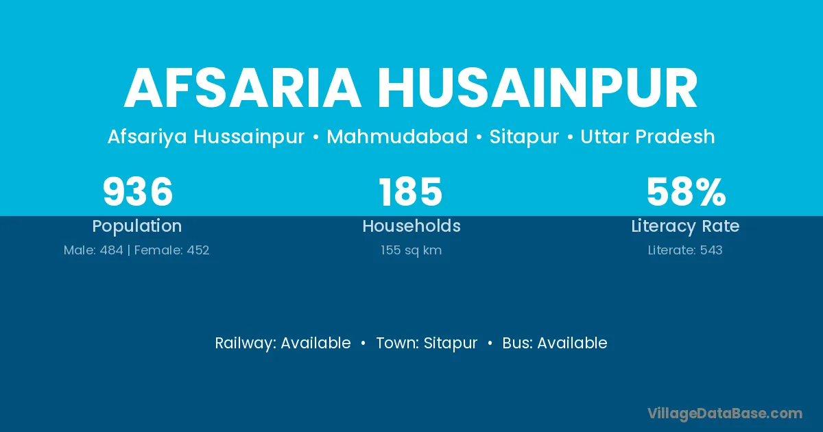 Afsaria Husainpur village has a total population of 936 people, of which 484 are males and 452 are females.