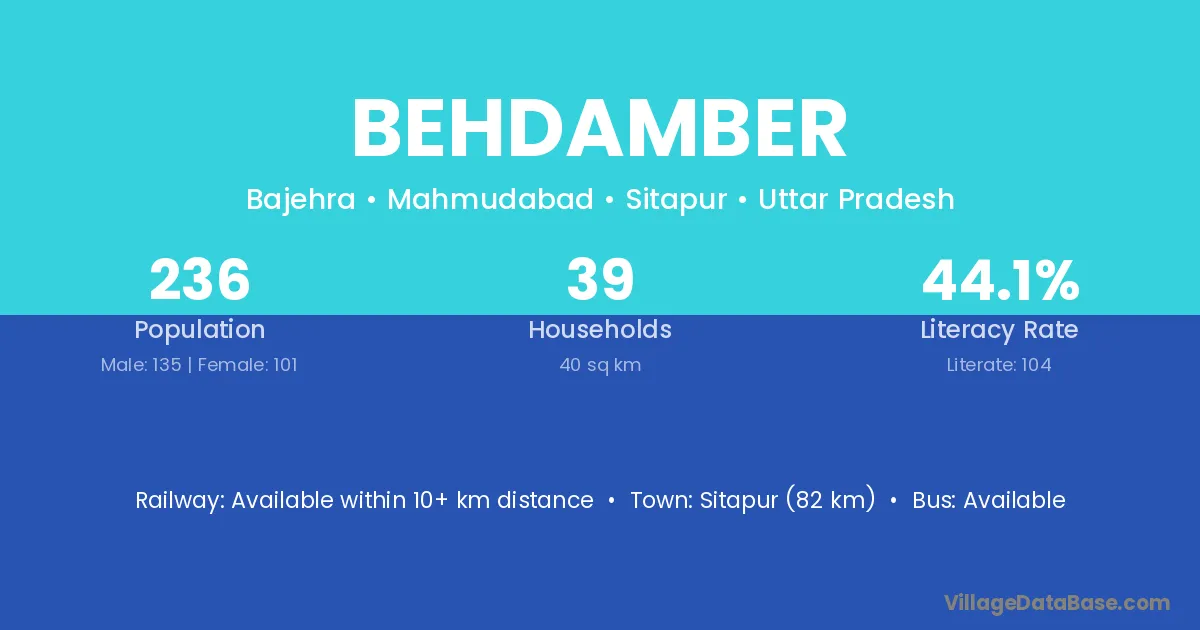 Sitapur (82 km) is the nearest town to Behdamber village for major economic activities and is located approximately 82 km away.