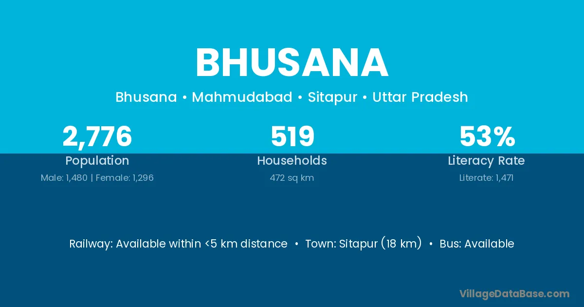 Sitapur (18 km) is the nearest town to Bhusana village for major economic activities and is located approximately 18 km away.
