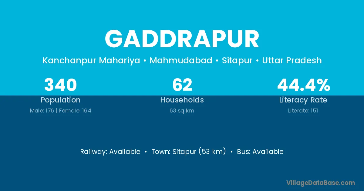 Sitapur (53 km) is the nearest town to Gaddrapur village for major economic activities and is located approximately 53 km away.
