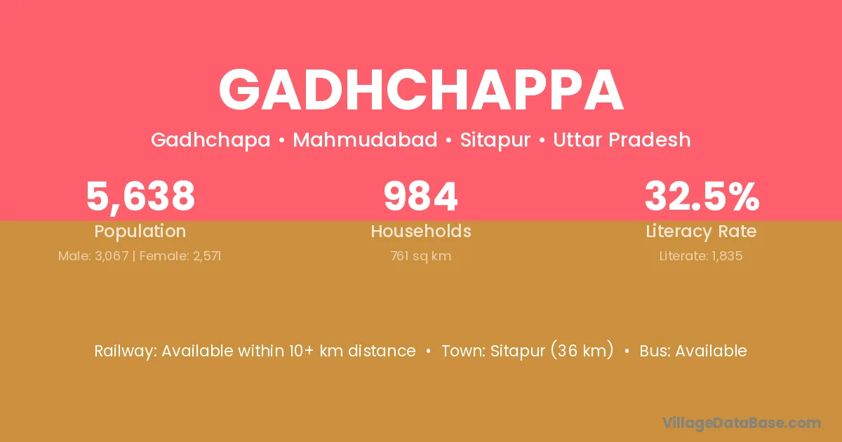 Sitapur (36 km) is the nearest town to Gadhchappa village for major economic activities and is located approximately 36 km away.