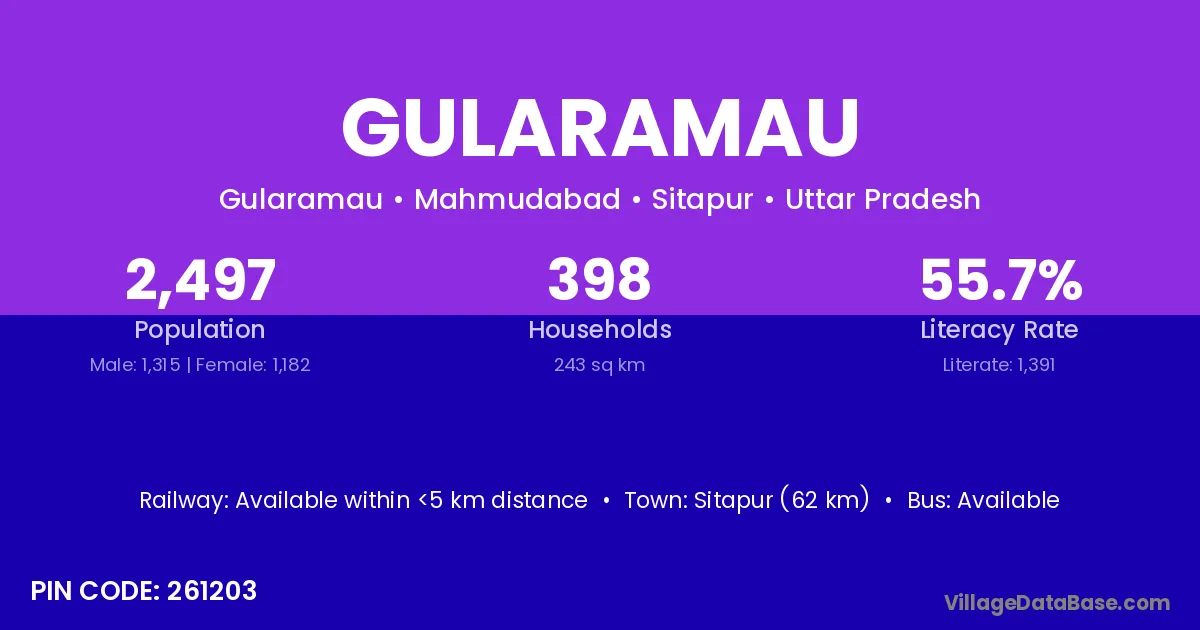 Sitapur (62 km) is the nearest town to Gularamau village for major economic activities and is located approximately 62 km away.