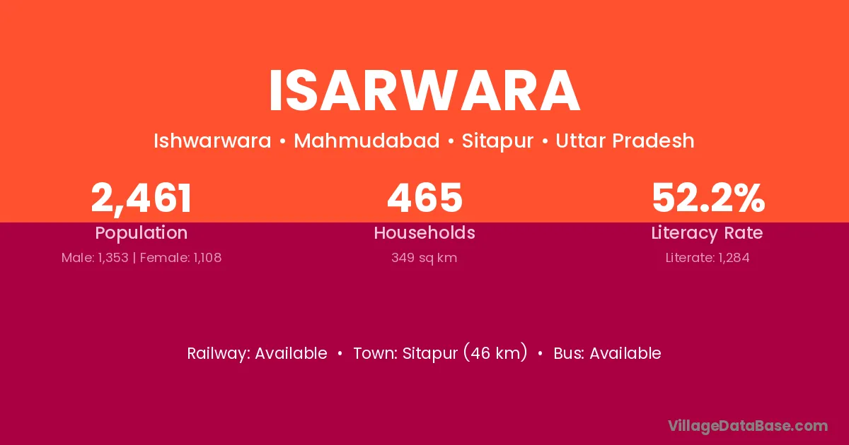 Sitapur (46 km) is the nearest town to Isarwara village for major economic activities and is located approximately 46 km away.