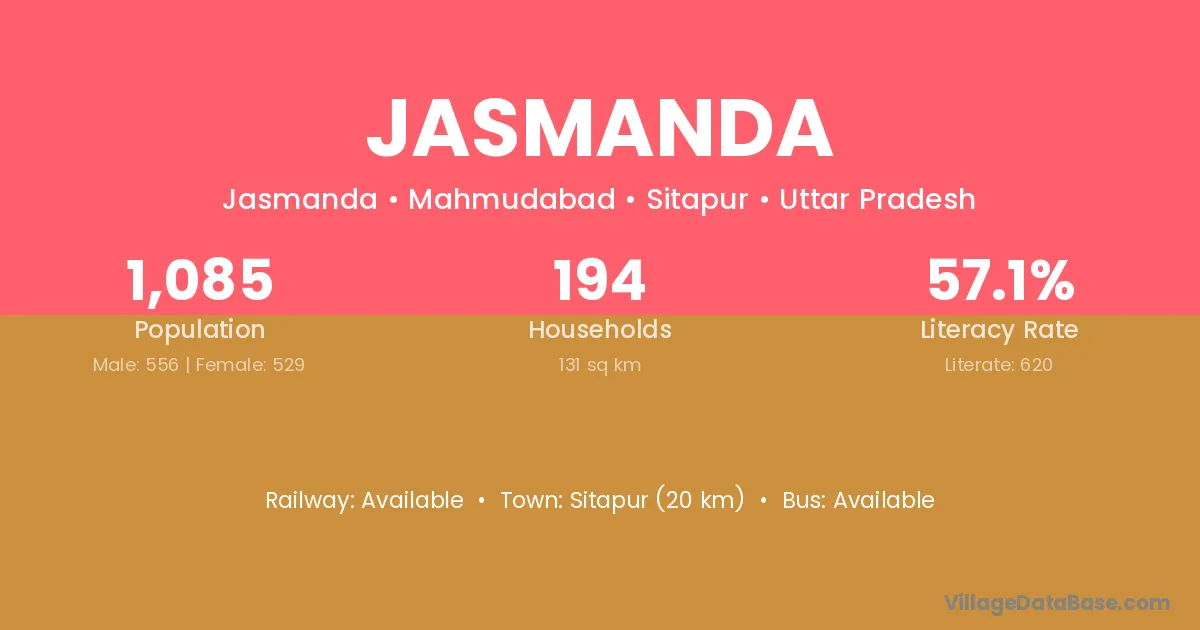 Sitapur (20 km) is the nearest town to Jasmanda village for major economic activities and is located approximately 20 km away.