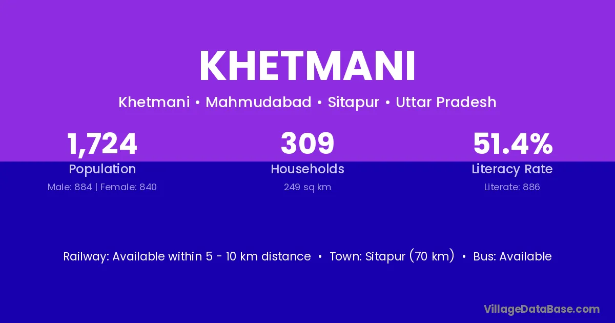Sitapur (70 km) is the nearest town to Khetmani village for major economic activities and is located approximately 70 km away.