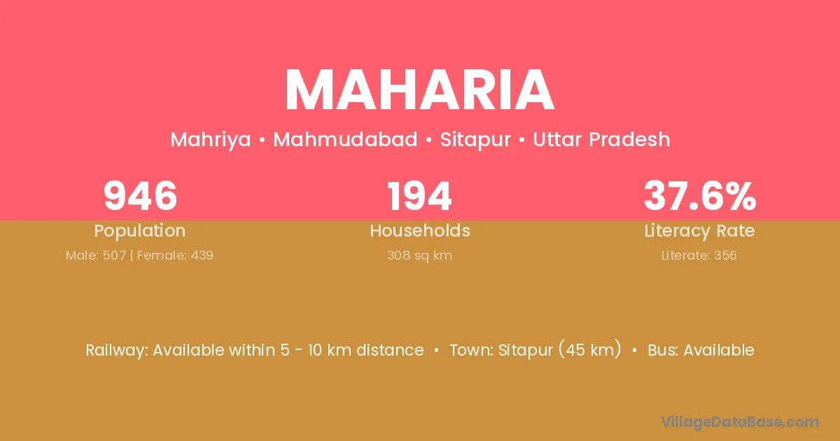 Sitapur (45 km) is the nearest town to Maharia village for major economic activities and is located approximately 45 km away.