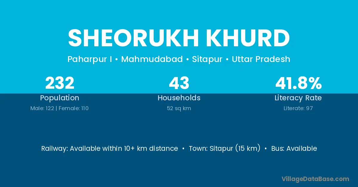 Sheorukh Khurd village has a total population of 232 people, of which 122 are males and 110 are females.