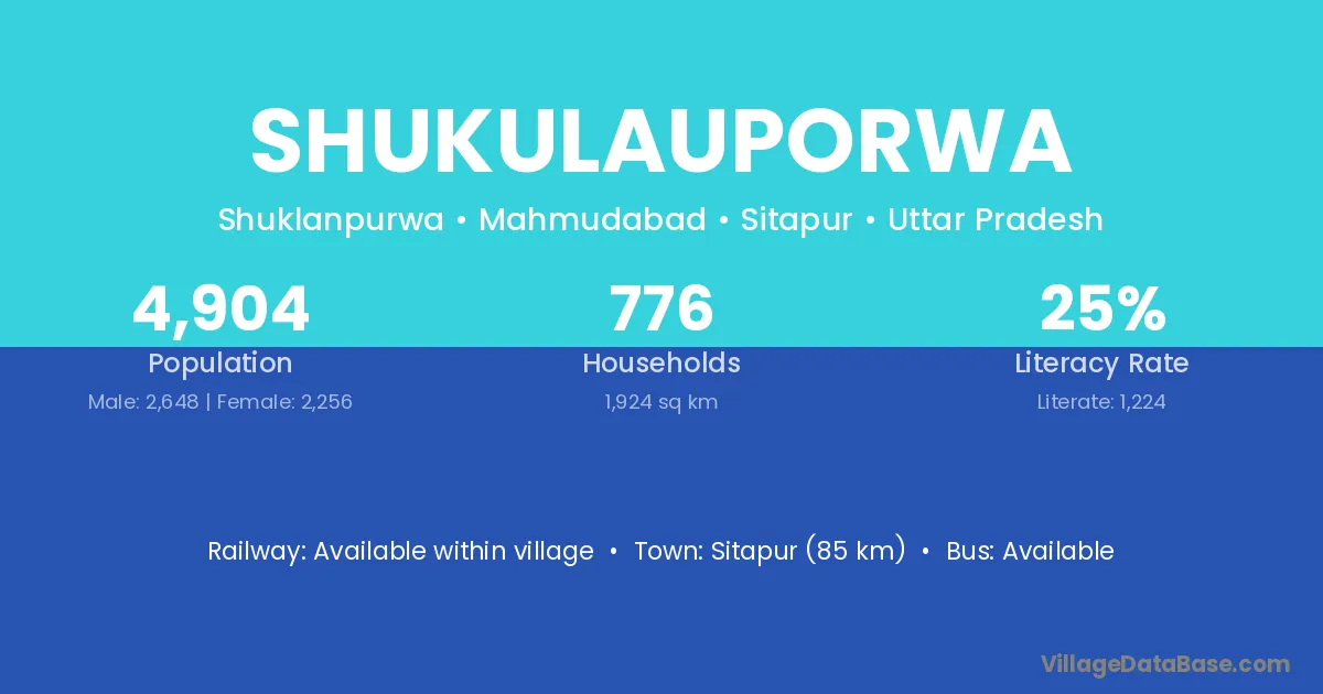 Sitapur (85 km) is the nearest town to Shukulauporwa village for major economic activities and is located approximately 85 km away.