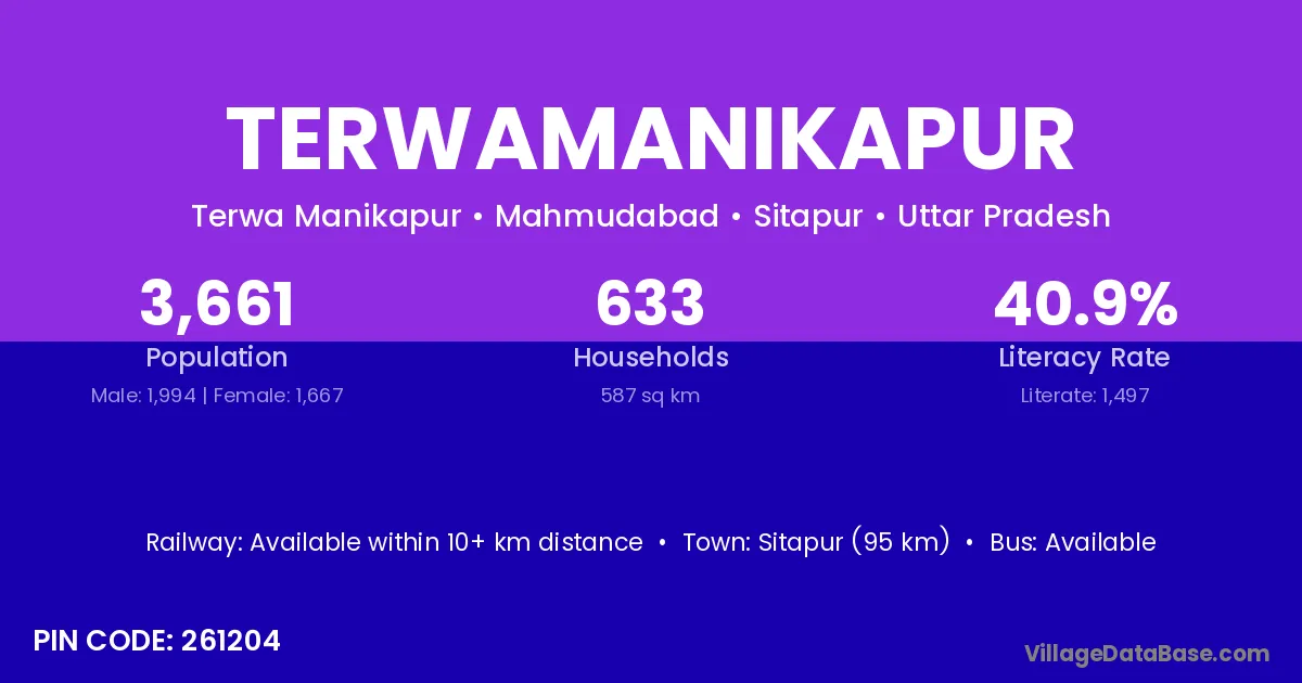 Sitapur (95 km) is the nearest town to Terwamanikapur village for major economic activities and is located approximately 95 km away.