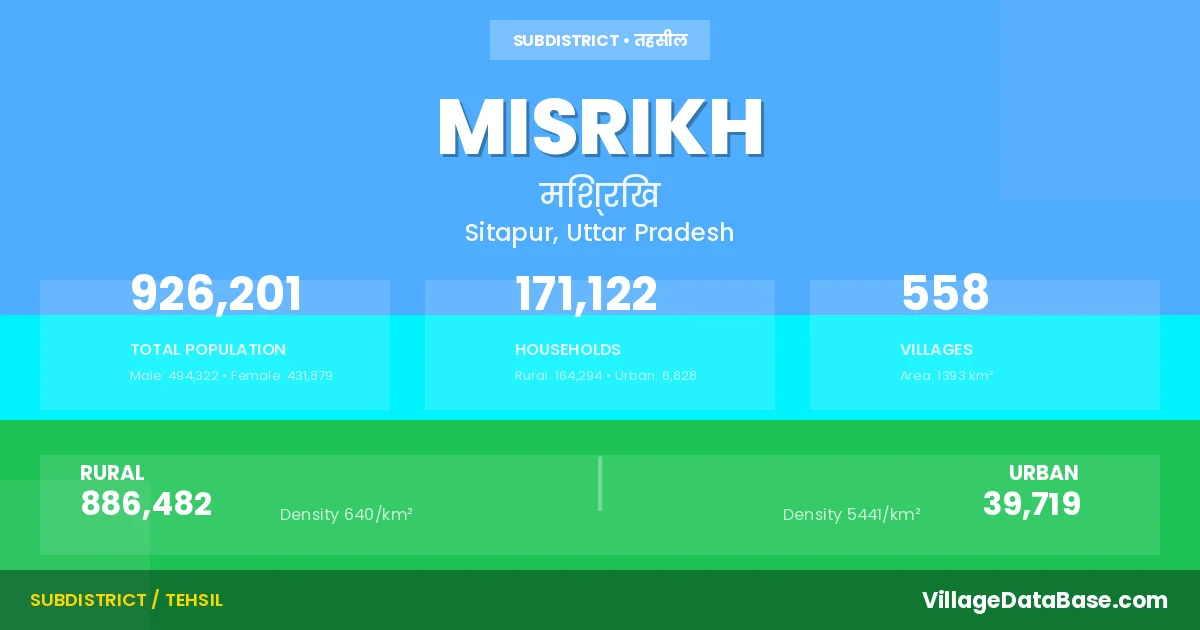 According to the 2011 census The total area of Misrikh Tehsil is 1393 km², with a population of 926201 people. The population density is 665 inhabitants per square kilometre, and there are approximately 171122 houses in the sub district.