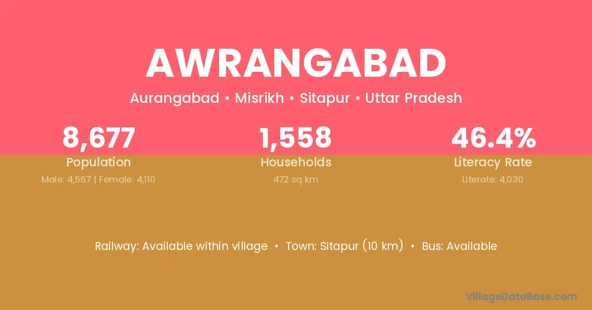Sitapur (10 km) is the nearest town to Awrangabad village for major economic activities and is located approximately 10 km away.