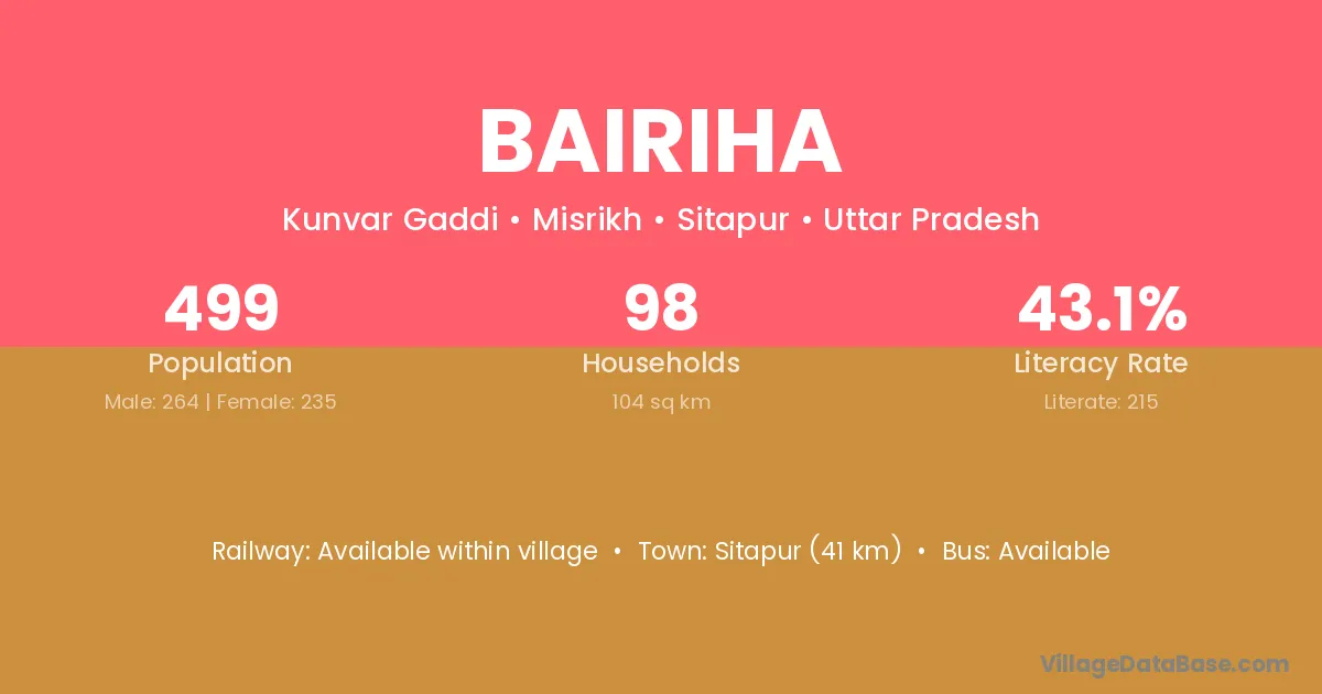 Sitapur (41 km) is the nearest town to Bairiha village for major economic activities and is located approximately 41 km away.