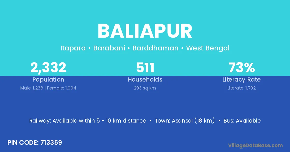 The literacy rate of Baliapur village is 44.13%. Male literacy stands at 51.28% and female literacy at 35.62%.