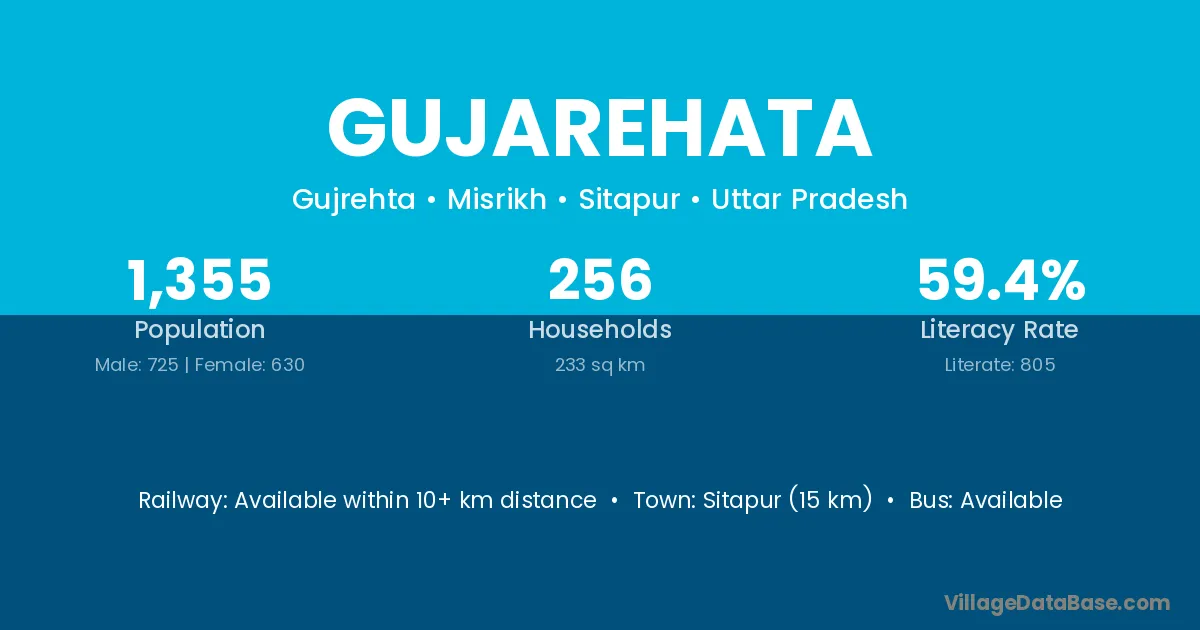 Sitapur (15 km) is the nearest town to Gujarehata village for major economic activities and is located approximately 15 km away.