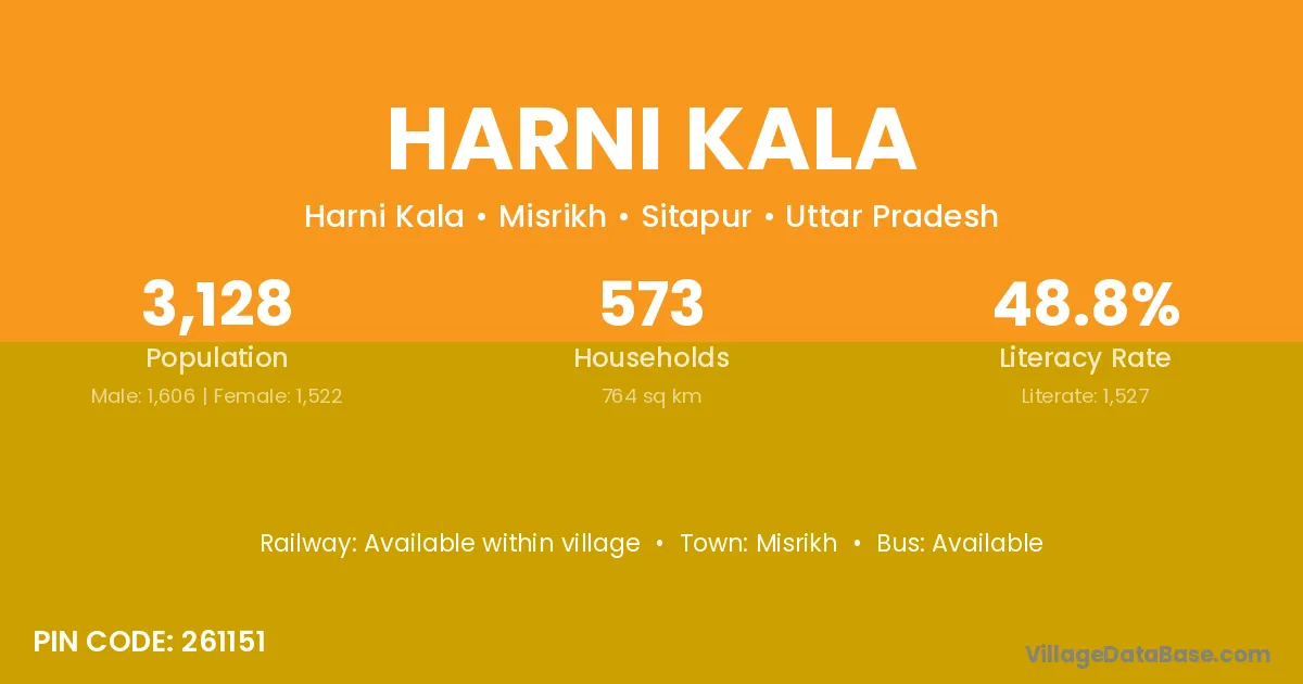 Harni Kala village has a total population of 3,128 people, of which 1,606 are males and 1,522 are females.